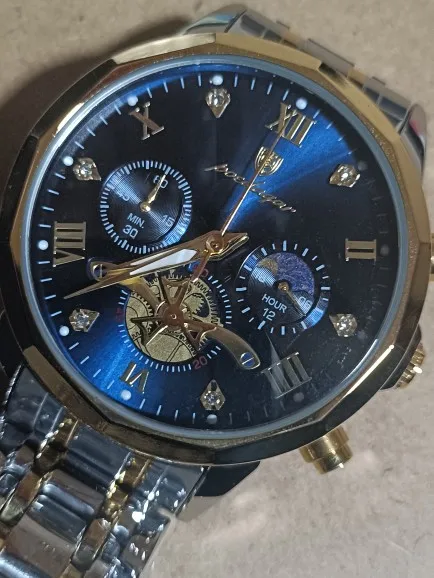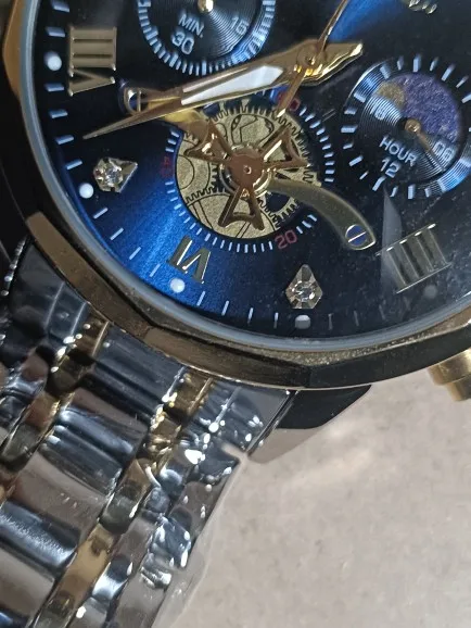 Affirmez votre style avec cette montre homme POEDAGAR de luxe - une montre sophistiquée avec chronographe fonctionnel, aiguilles lumineuses et boîtier/bracelet acier inoxydable, disponible en 10 combinaisons de couleurs (argent noir/bleu/blanc, or vert/blanc/bleu/vert/blanc, or, noir), résistante à l'eau 3 Bar adaptée à la natation, livrée avec coffret complet, parfaite pour le bureau, le sport et toutes vos occasions.