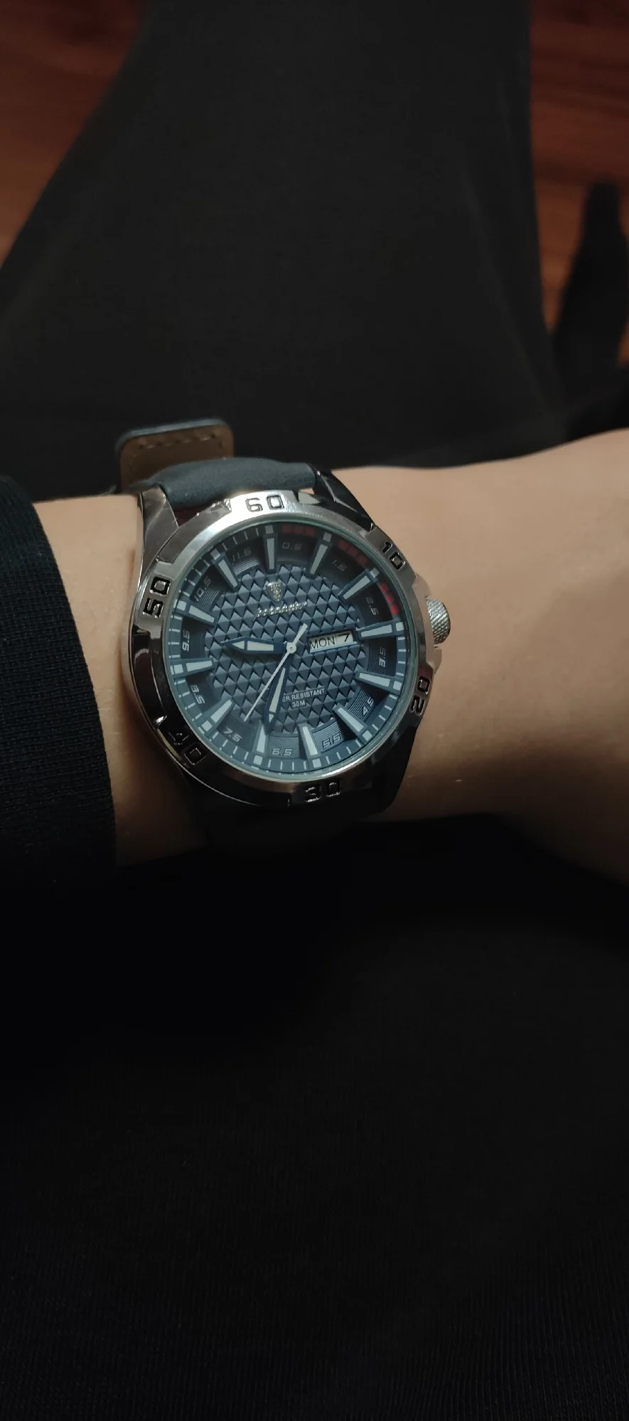 Cette montre dispose d'aiguilles lumineuses qui permettent de lire l'heure dans l'obscurité :